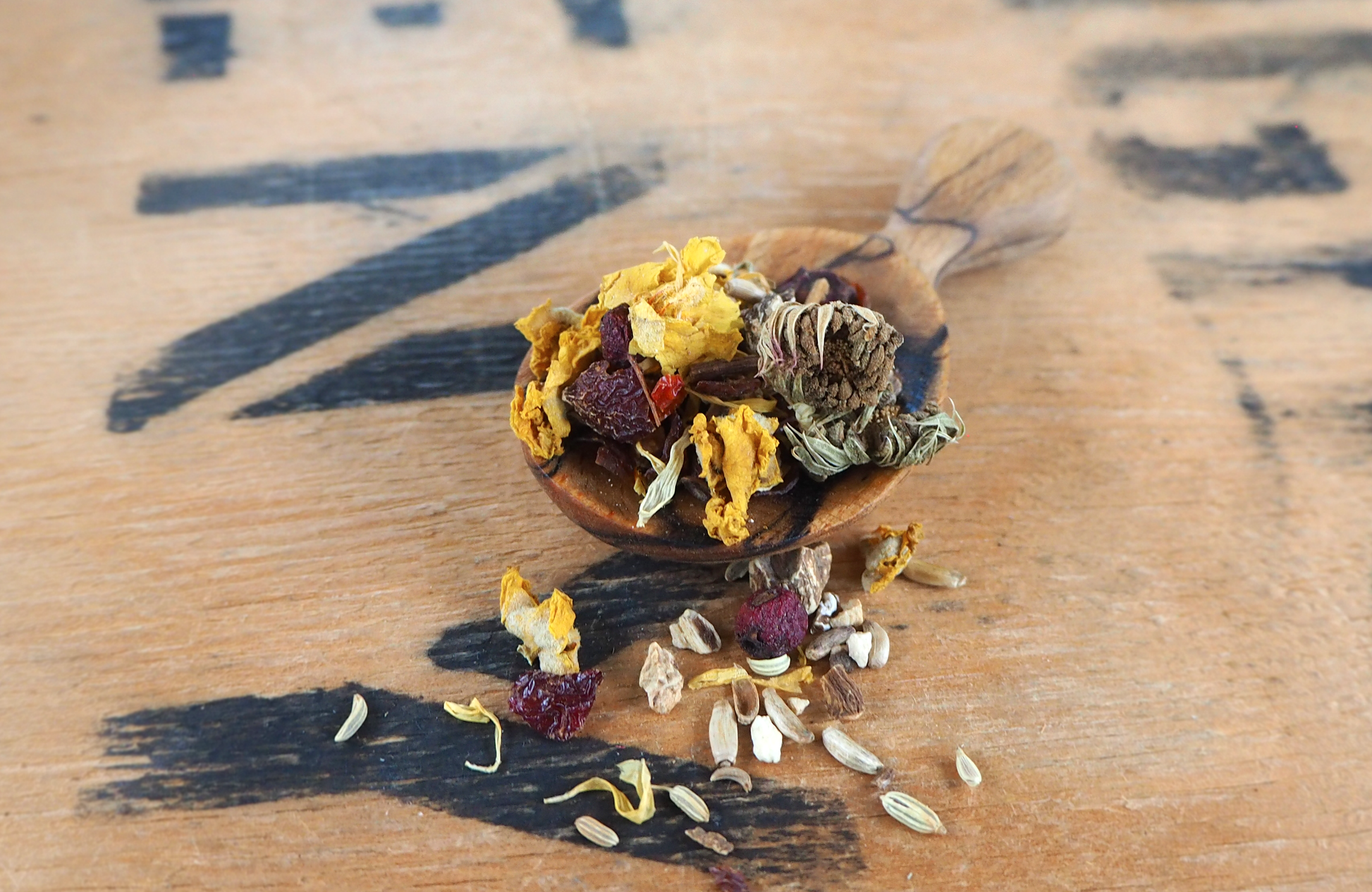 Dandelion Root, Mullein Flower, Rosehips, Calendula, Hawthorn Berry & Fennel Seed.