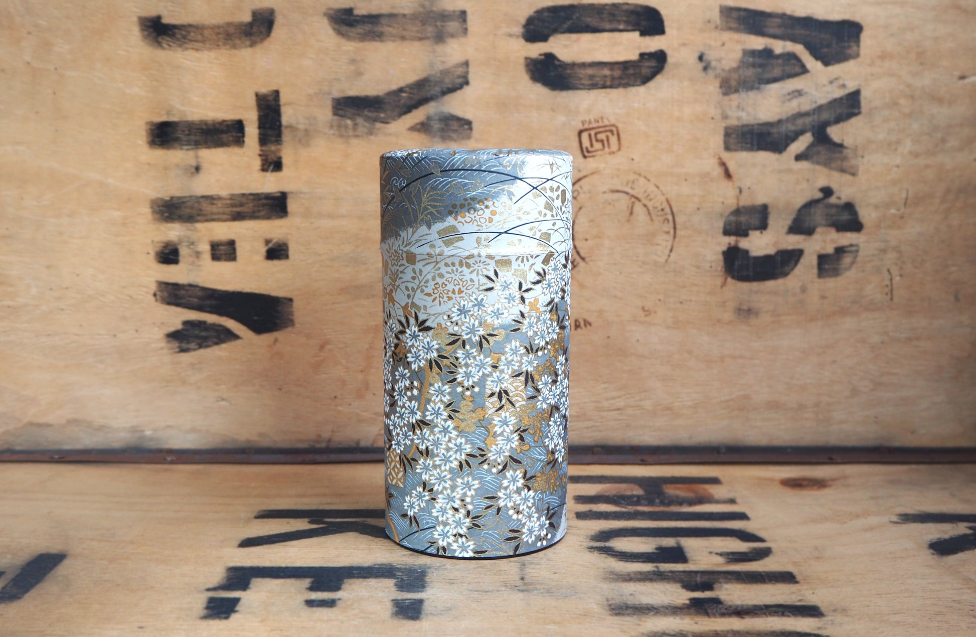 A classic style of tea caddy with a Japanese design. Beautifully depicted are delicate flowering blossoms and golden and black foliage on a background of silver grey, an energetic scene, full of motion reminiscent of meadow life.