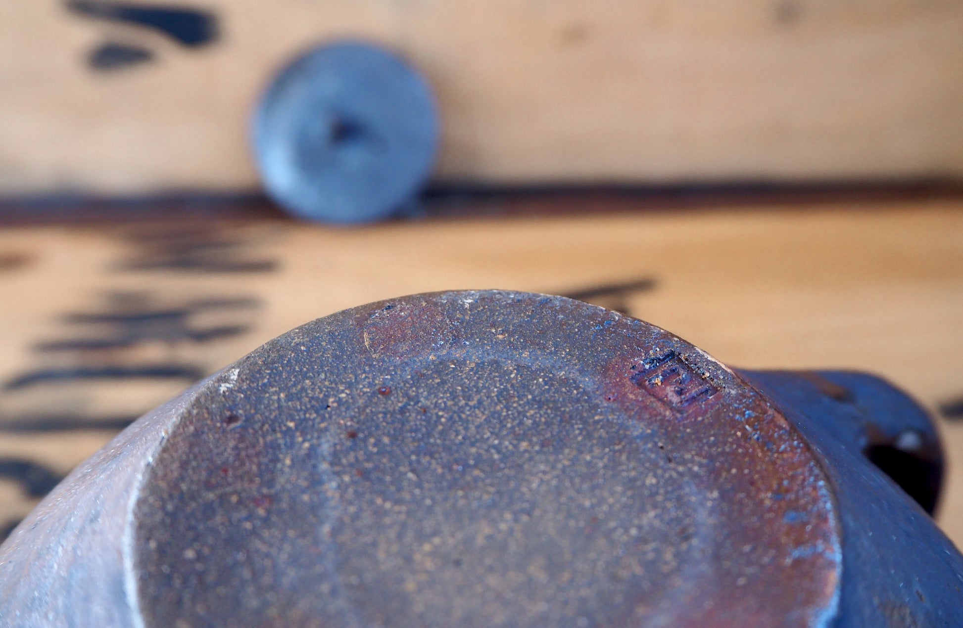 A stunning wood fired stoneware Teapot, with a satisfying balanced curve form. Skilfully crafted with care and consideration. An excellent weight and proportion. A generous capacity of 700ml. Styled with a back handle and tapered single hole spout, with a great pouring action and a diamond finial on the lid, a wonderful detail. Applied outside is an iron wash giving it a robust appearance with blending blackish, blue and purple tones. Inside is ash glazed with a bright and contrasting blueish tone. The surface has a gentle roughness from the granular clay inclusions and a soft shine. A comfort to handle and a joy to use.Â