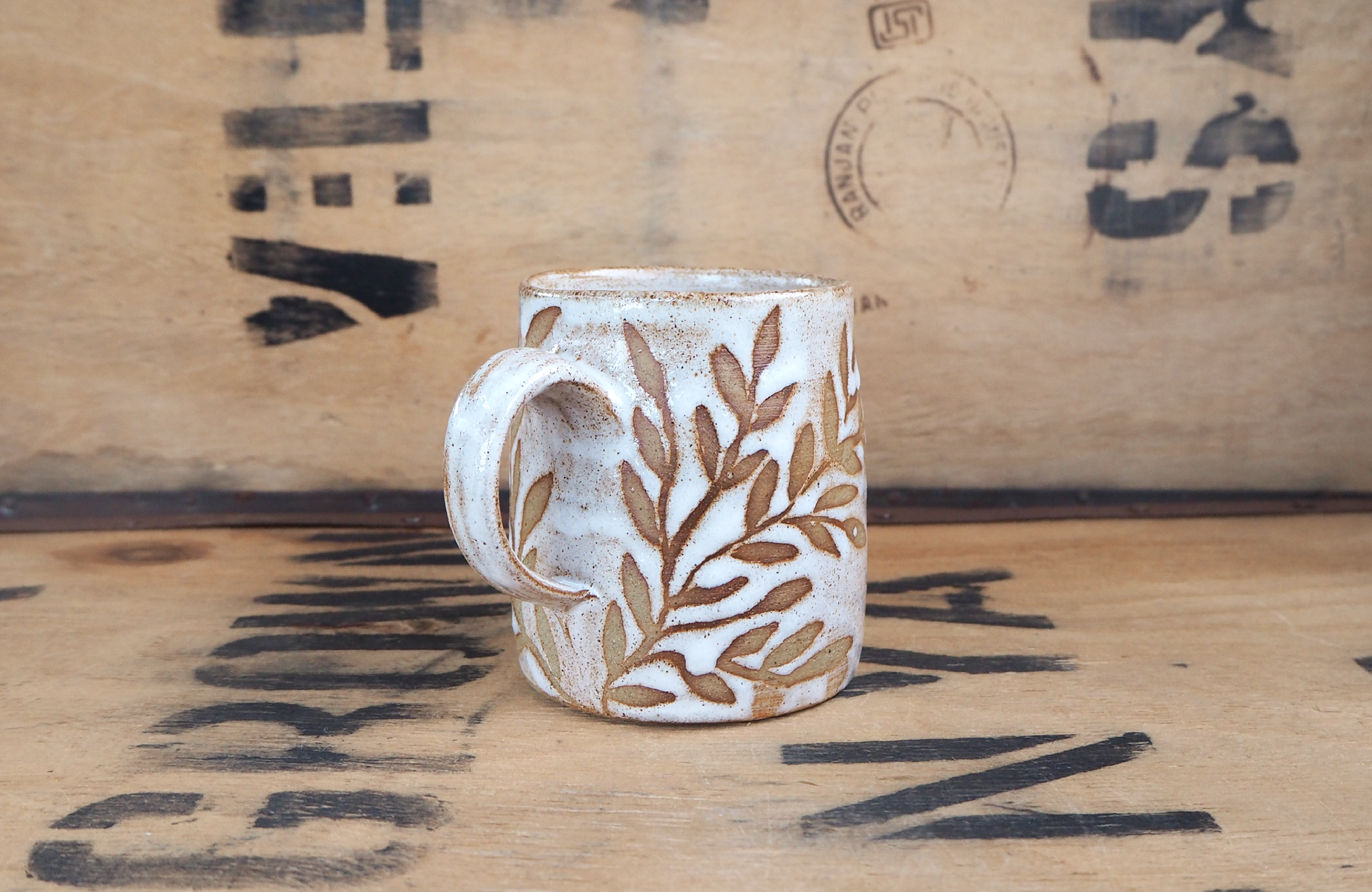 A smooth, bright glaze gives the mug an airy, calming feel contrasting nicely with earthy tones of the stoneware clay that features a leafy, foliage design in wax relief, both these elements together create a very tactile surface. It’s a joy to hold and drink from with a style that’s very easy going and approachable with superb functionality.