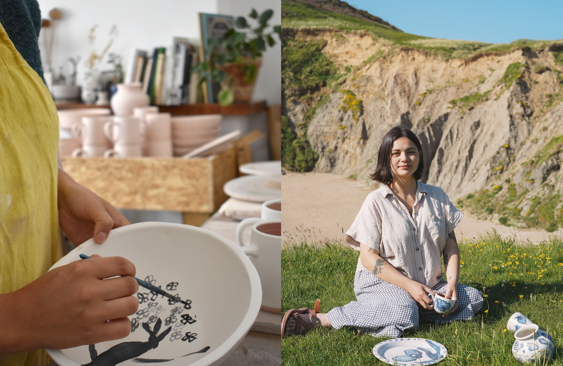 Ceramics for Ella Bua-In has been a full time endeavour since 2019, having previously studied fine art and experimenting with ceramics, combining painting and pots as a form of storytelling. Drawing inspiration from Japanese woodblock prints, medieval art, Roman frescos and the West Welsh landscape. All her designs are truly unique and directly painted on the surface with no initial sketches or outlines. Now residing in Cardigan and working from her home studio, creating tactile and functional pieces for everyday use.