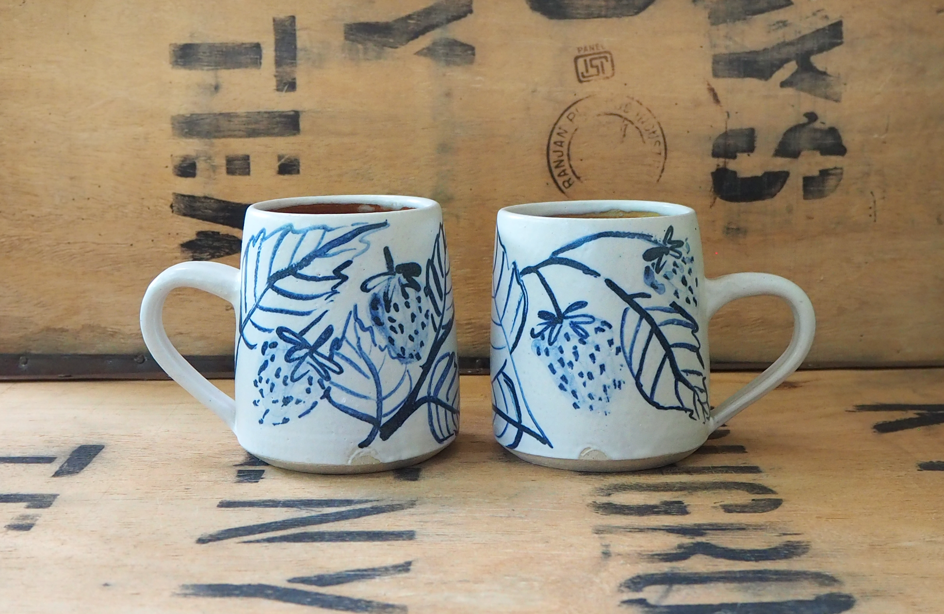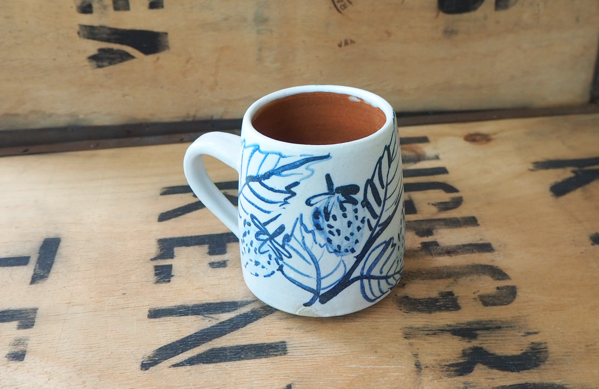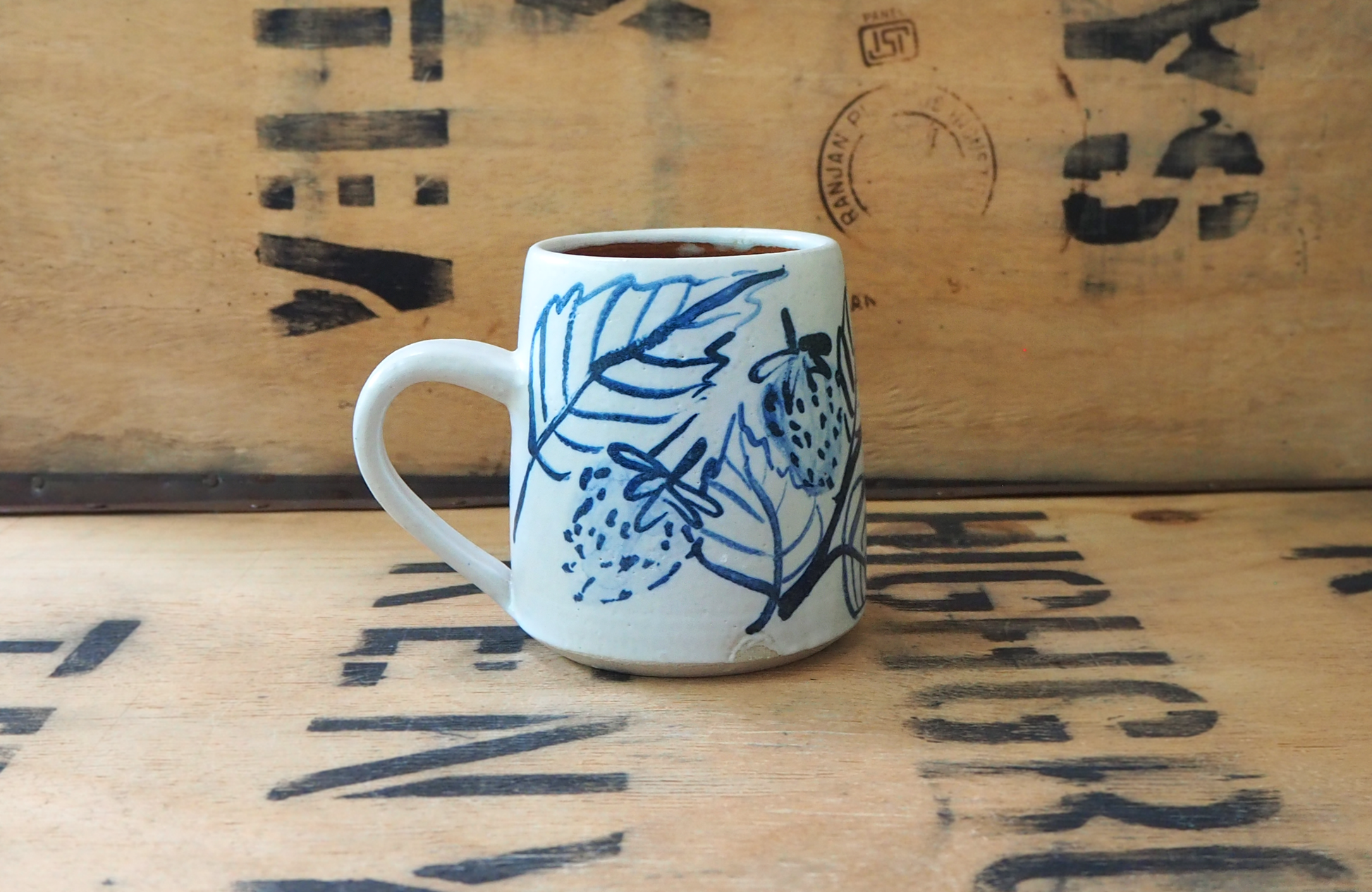 A delightful stoneware mug with hand painted whimsical illustrations of strawberries & leaves. Blue cobalt oxide painted over a chalky, matt white glaze with a contrasting rusty peach tone inside. Smooth surface with slight texture from the clay.