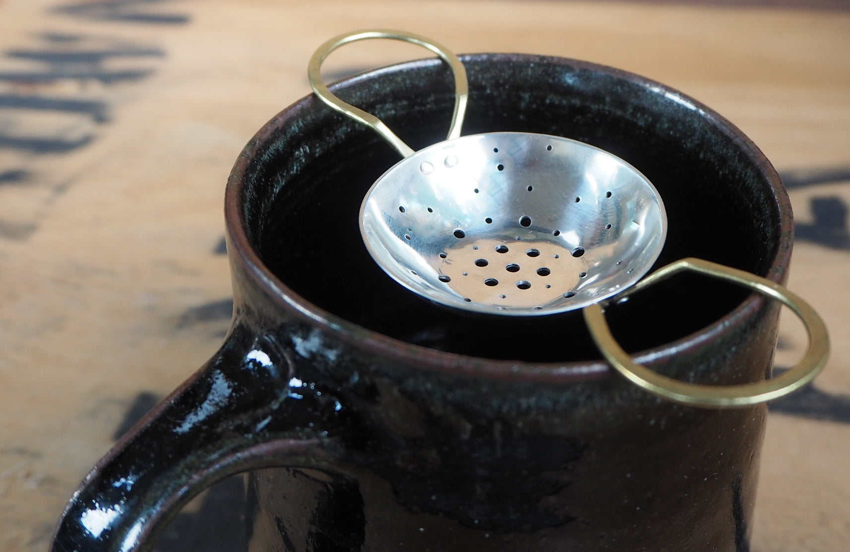 A hand formed Tea strainer made of recycled sterling silver, riveted with eco silver with fine hammered brass loop handles. Skilfully crafted with great care, each rivet unique, and proportions perfect, creating a stunning aesthetic and contrast. For those extra special tea occasions.