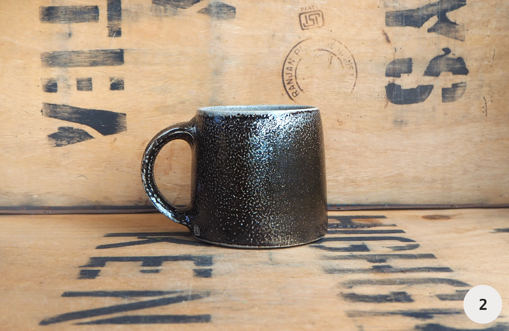 1 ~ A straight form with a black tone with large soda coverage creating an ‘orange peel’ like texture. Stone grey band around the lip with earthy brown tones and a fine crackle inside. Smooth and comfortable to hold.