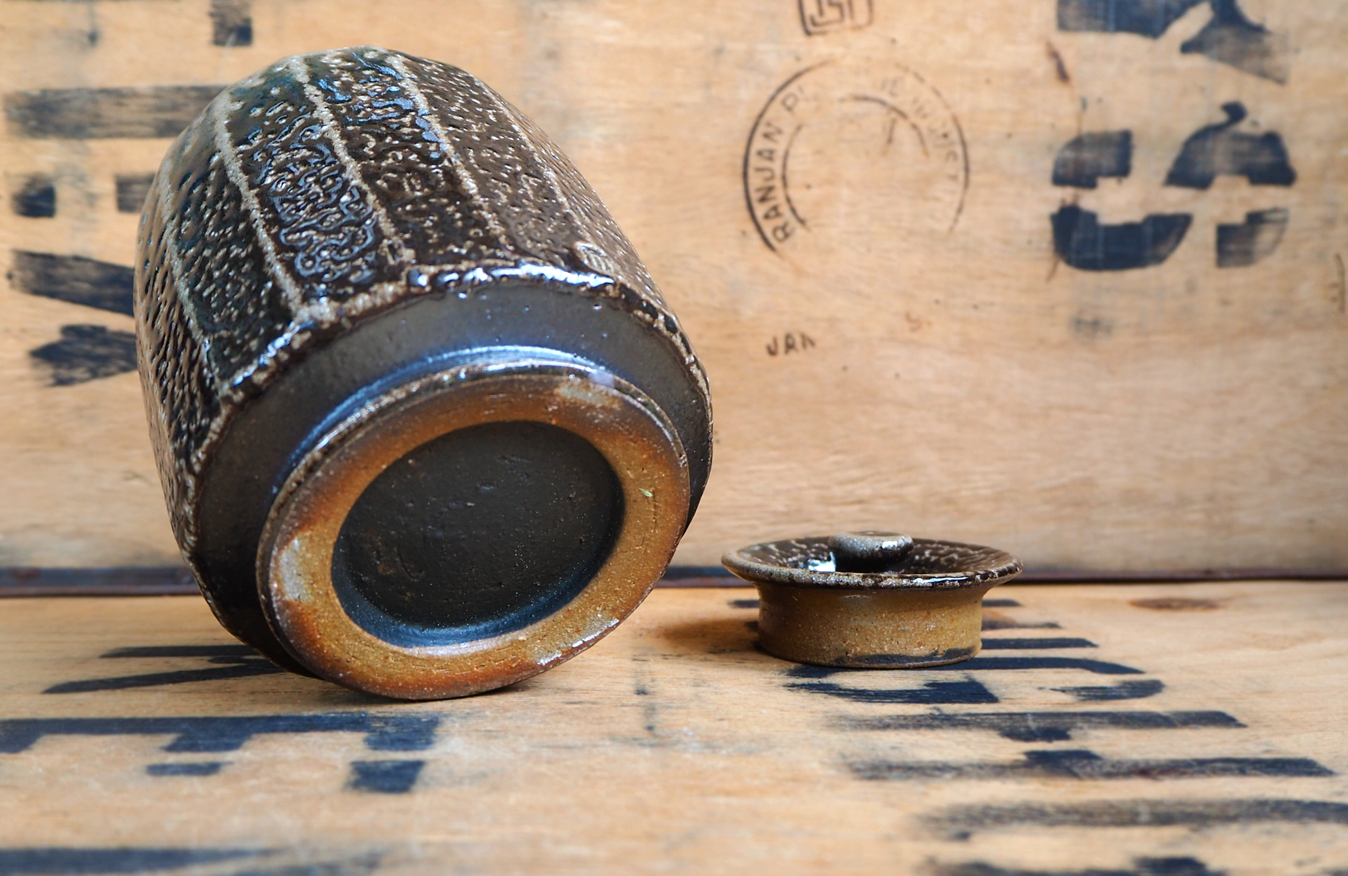Skilfully crafted from Cornish clay, that’s been gasfired with soda. The tall form and faceted carving is very effective in aesthetic and textural quality, so tactile and satisfying. We love its striking, bold deep blue tones catching the light beautifully. A smooth texture and interesting surface from the carving and added soda pattern with a soft shine. An inset lid reveals a decent size opening, with a wood ash glaze contrasting nicely with a fine crackle. Finished with a formed foot. Holding neatly in the hand.
