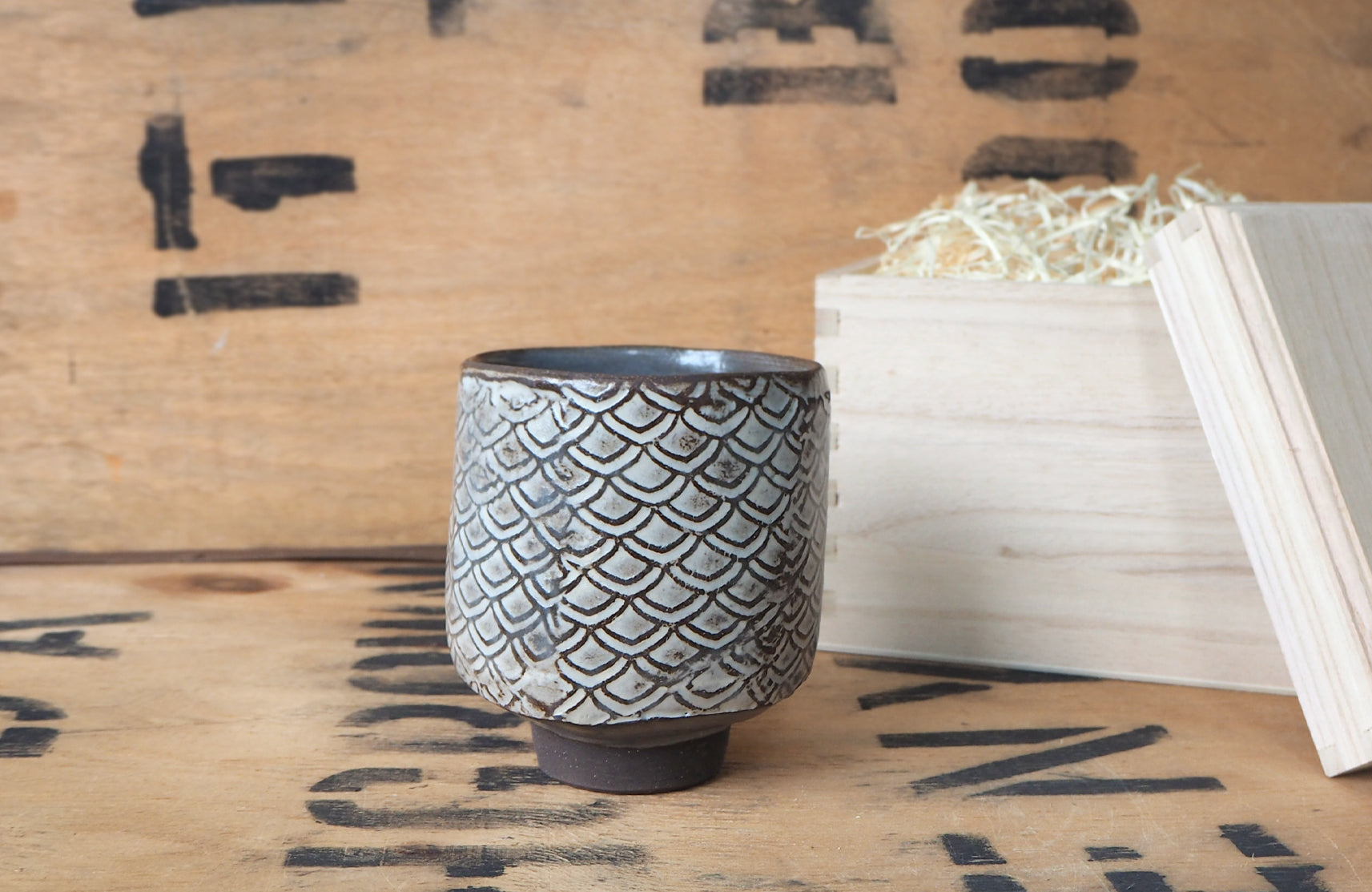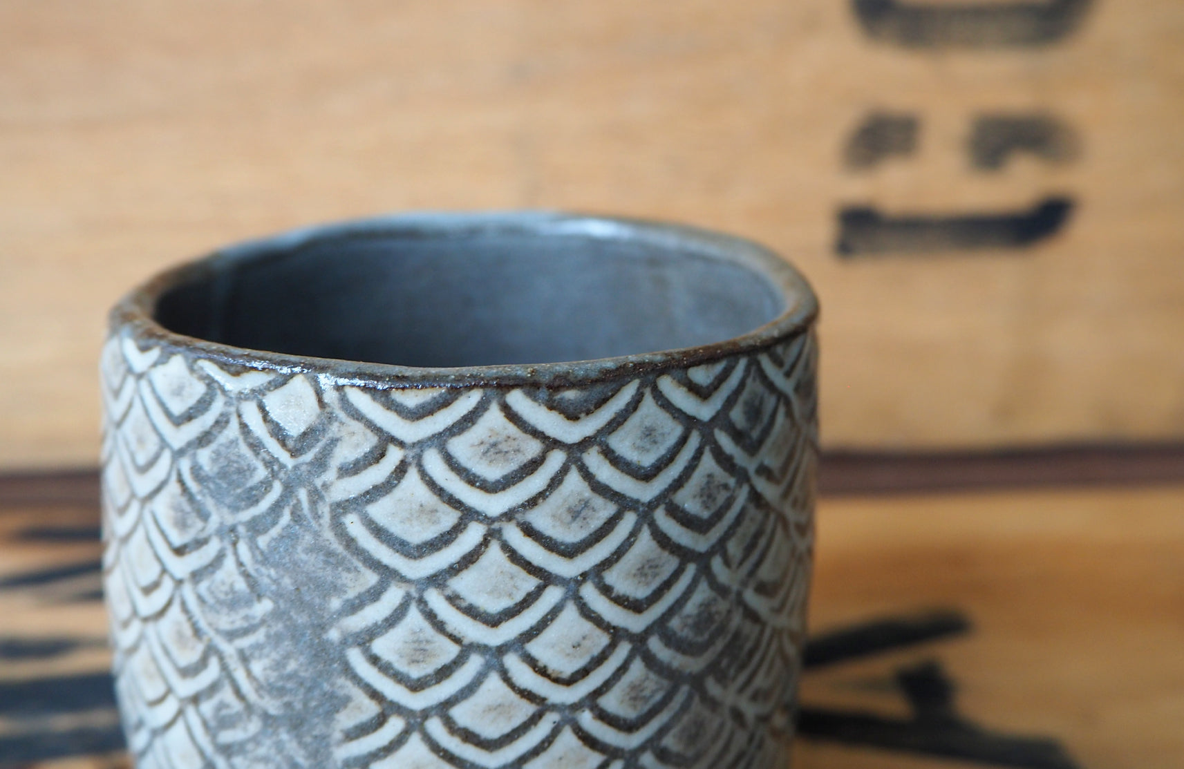 The vessel has been created through a combination of wheel thrown and hand carved kurinuki processes. Crafted from a black stoneware clay and glazed in a a semi transparent glaze thats sits between a Buncheong style and Nuka style, plus a white slip glaze. On the surface, a beautiful blue grey tone sits beneath an embossed wave pattern accented by a smooth white slip. Finished with a carved angular foot and smooth lip, this larger, tall Yunomi is satisfying with a large capacity, holding comfortably in the hand.