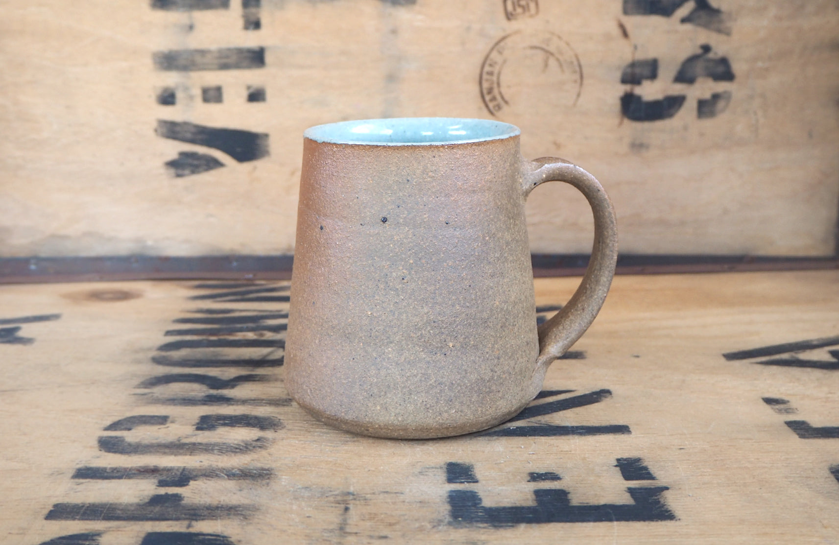 A super satisfyingly large tankard style stoneware mug, created with iron rich Cornish clay, intentionally left unglazed on the exterior, as the wood firing creates a natural flow and gradient of vibrant and warming tones, toasted orange, browns and a detail of natural speckled ashing due to long firing all with a tactile feel. The interior glazed in a cool jade celadon, offering brightness and fine glassy crackle.