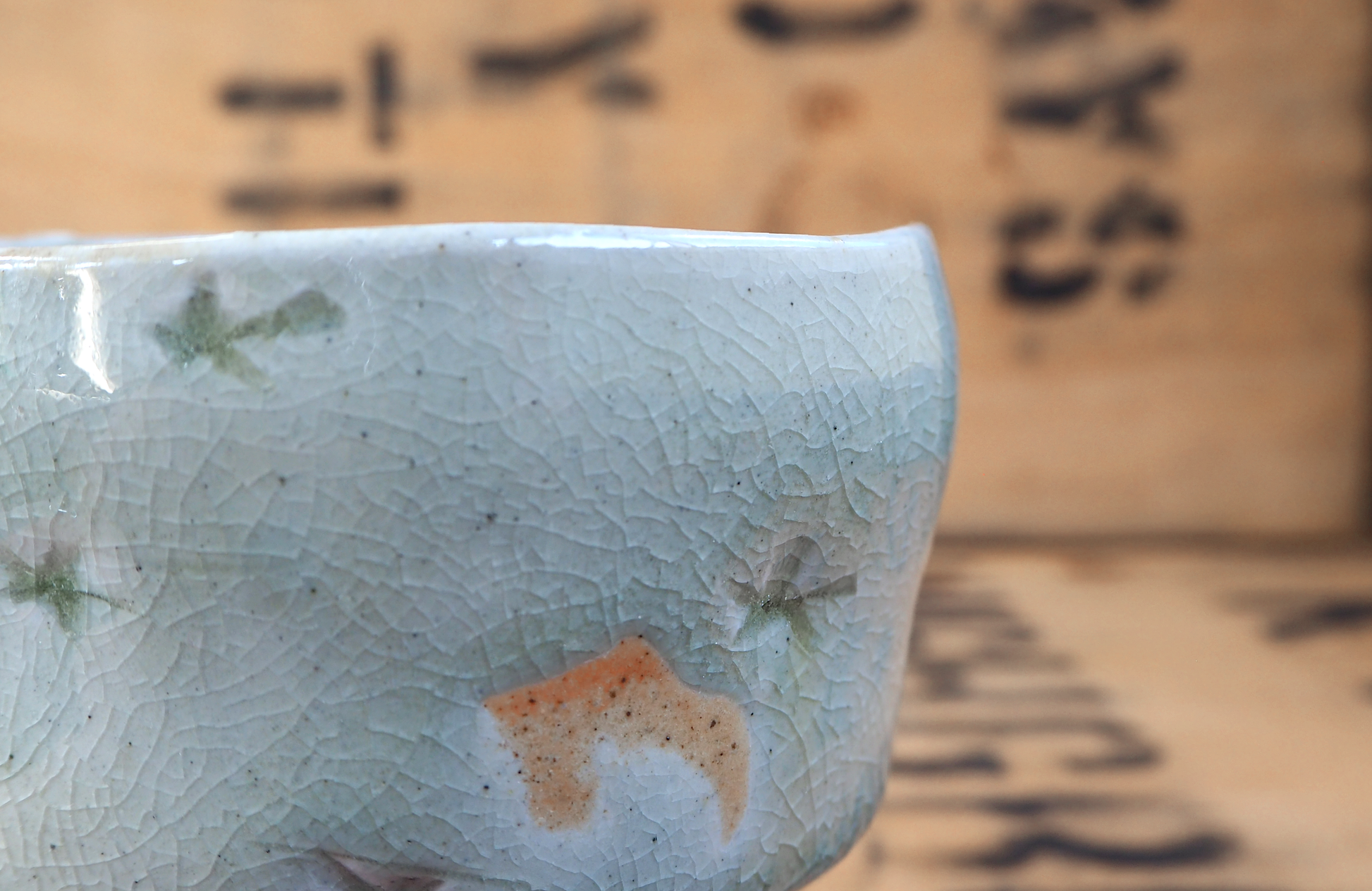 Skilfully formed from porcelain with areas of natural ash and areas left raw clay with a celadon interior. Super satisfyingly large with a wavy, wabi lip and free formed sides creating a characterful tea bowl form.