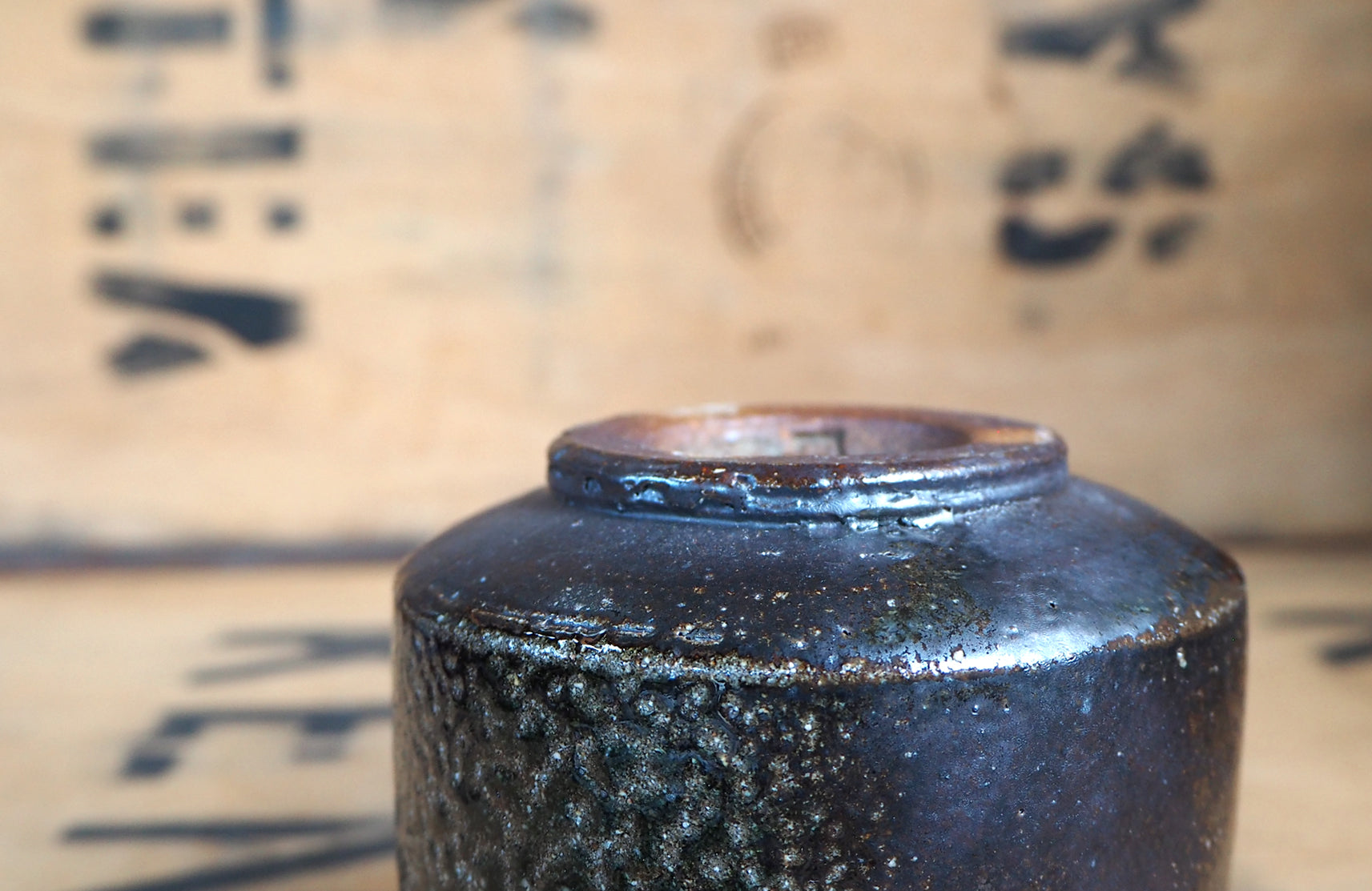A stunningly rich iron black yunomi with intricate areas of soda, full of mottled green crackle. An excellent surface texture, holding comfortably in the hand with a taller form. Really enjoying its bold presence that adds weight and substance.