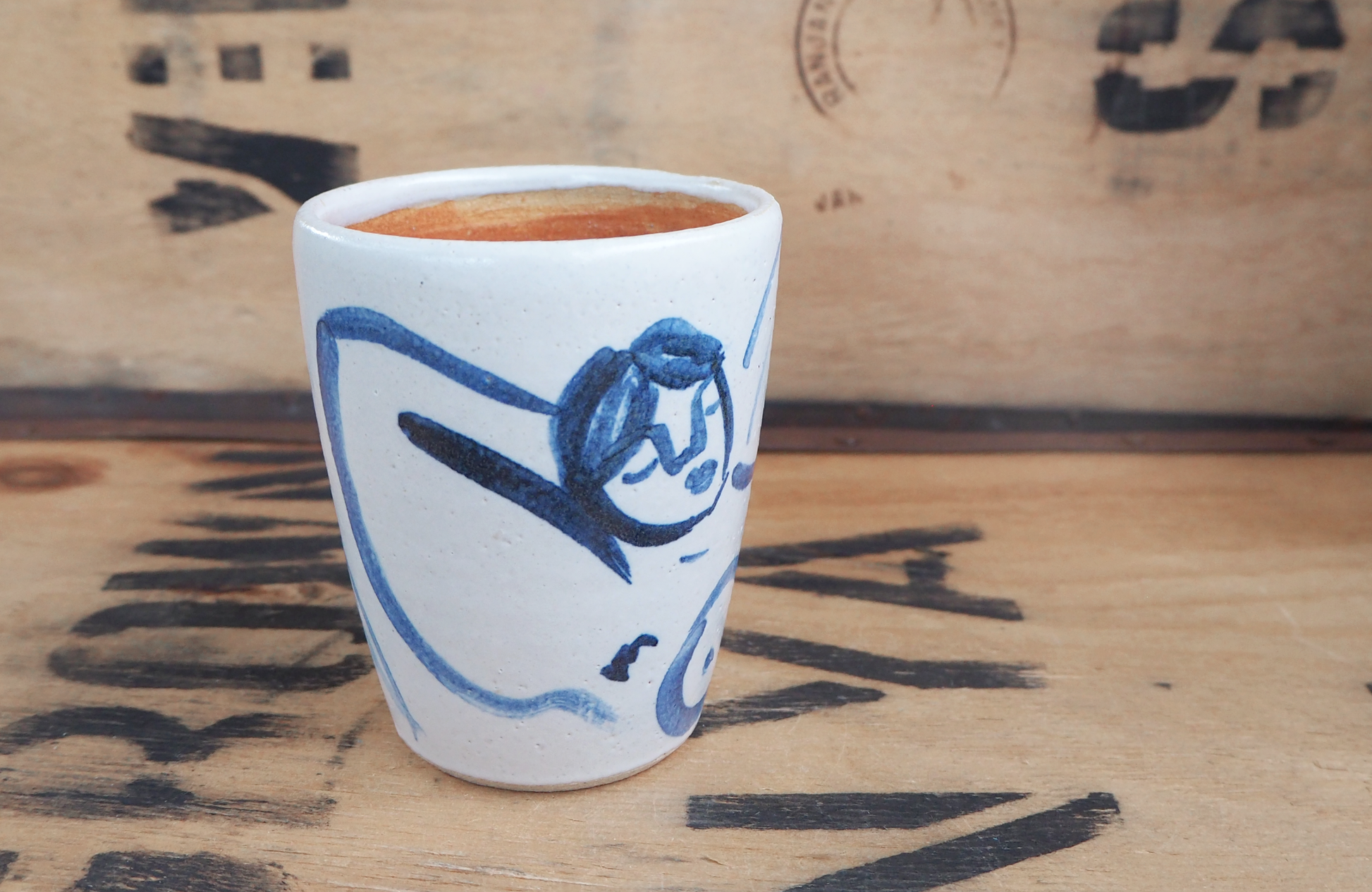 Smooth stoneware yunomi with a hand painted whimsical illustration of a reclining nude. Blue cobalt oxide on a matt white glaze with a contrasting rusty peach tone inside. Smooth surface with slight texture from the clay, holding comfortably in the hand.
